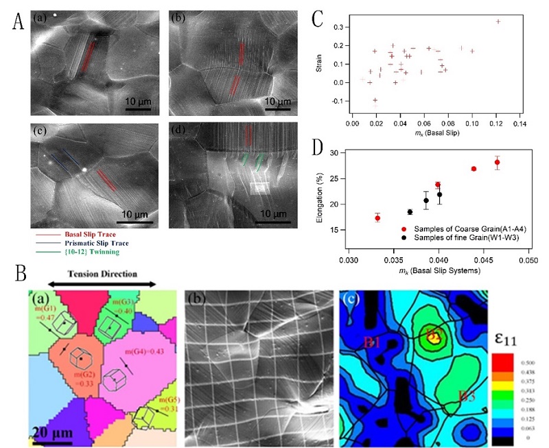 图 (A) 滑移迹线分析 (B)局部应变分析 (C) mk值与晶界附近局部应变的关系 (D)平均mk值与延伸率的关系