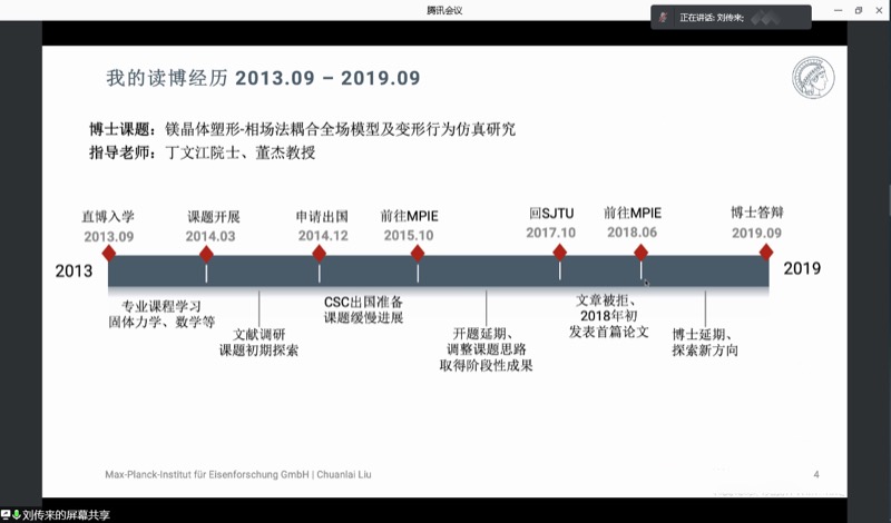 2021年6月7 日下午,材料学院博士生高水平学术就业专场交流会暨博士发展奖学金经验分享会在徐祖耀楼500号姚征报告厅召开。本次分享会邀请了上海交通大学2020年博士发展奖学金获得者、现在的德国马普所博士后刘传来博士跨洋进行线上分享,二十余名博士生参与此次分享会。材料学院学生培养办公室李琦老师主持。